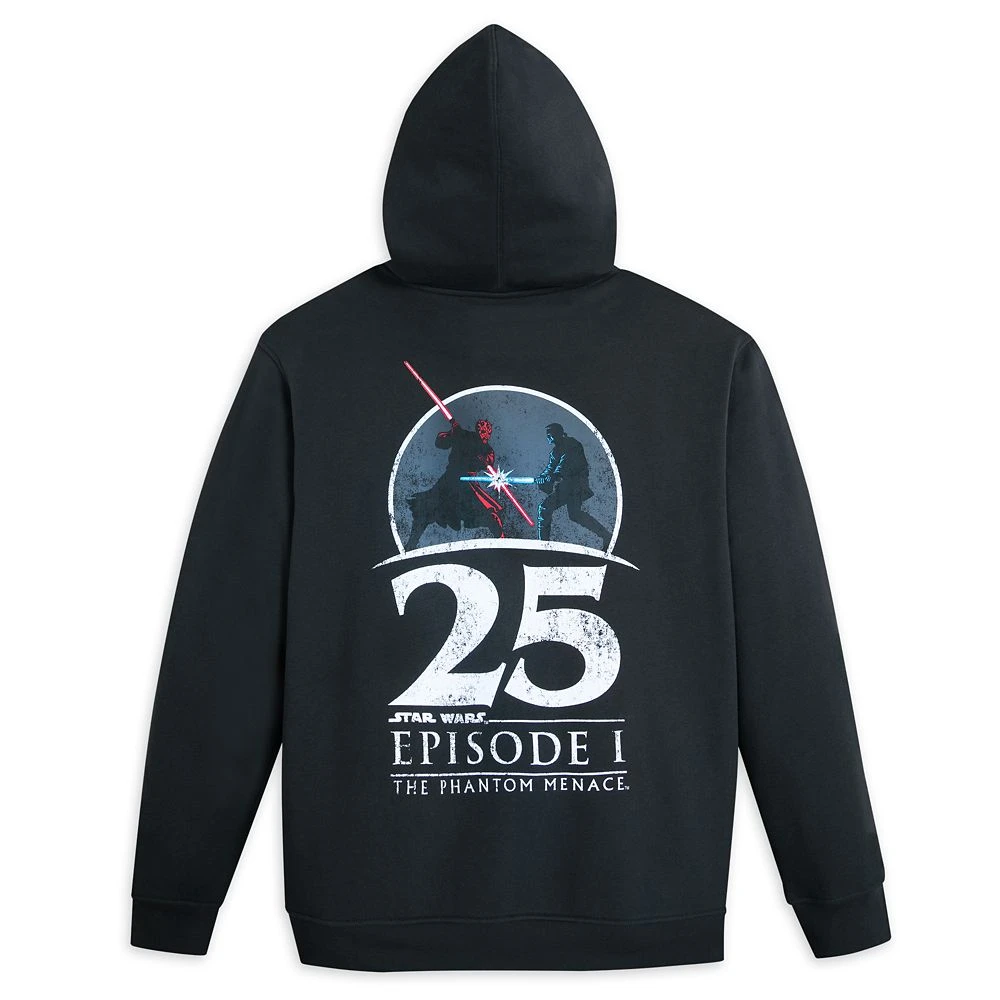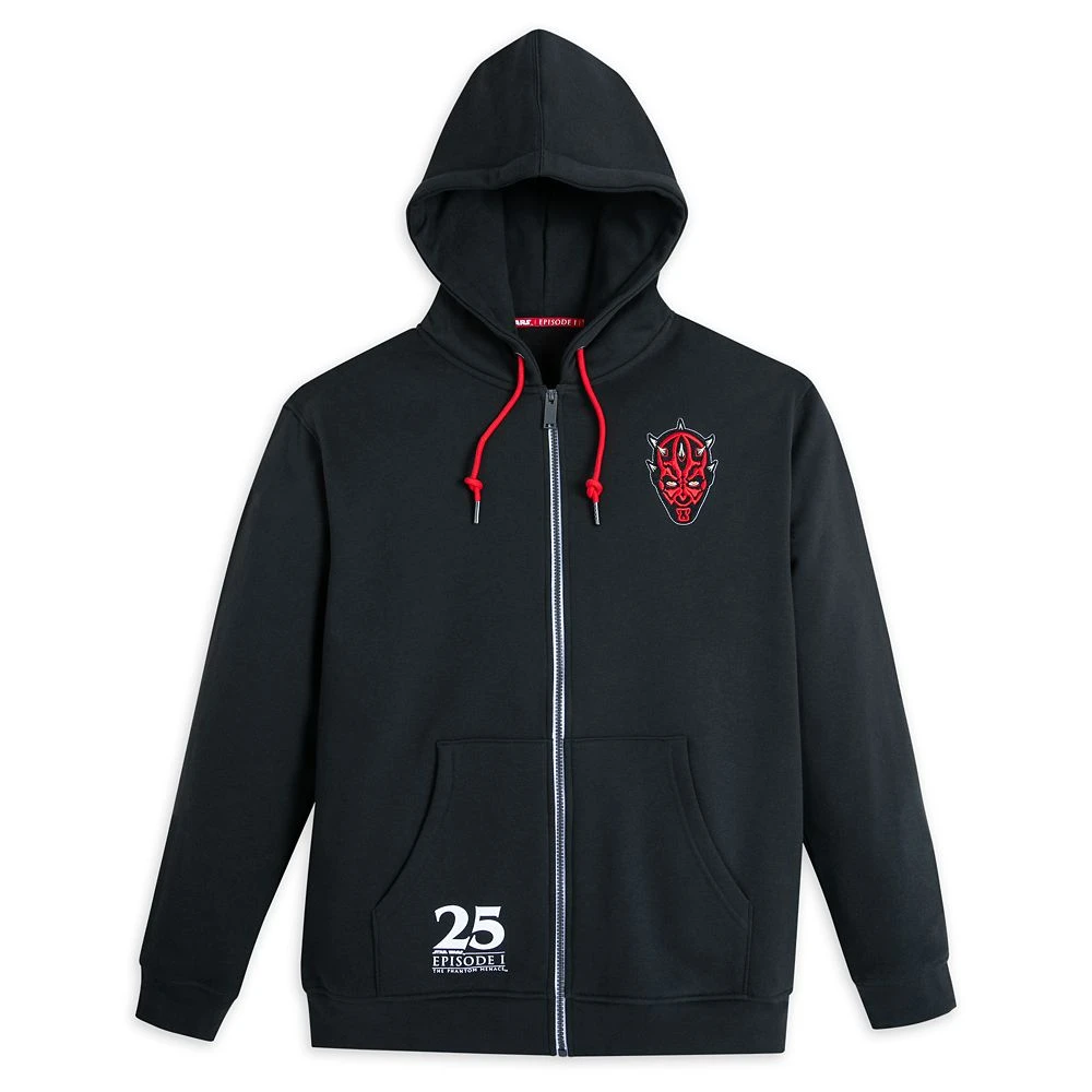 Warm-up your cold, dark sides in this hooded sweatjacket dedicated to devilish Darth Maul. Intimidate friends and foes with a fashion flair fit for ferocious warriors like you. The Sith Lord battles it out with Obi-Wan Kenobi on the back of this commemorative zip top that’s part of our salute to the 25th anniversary of Star Wars: Episode 1 – The Phantom Menace.