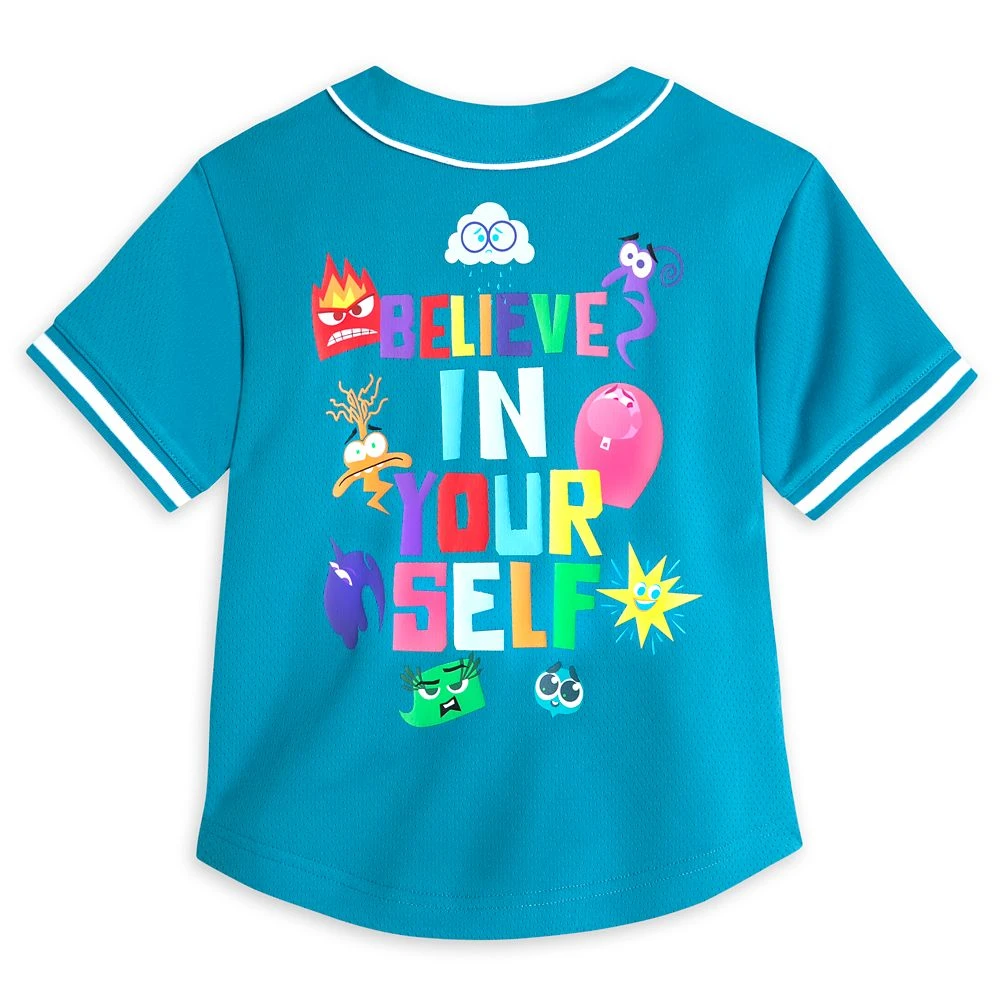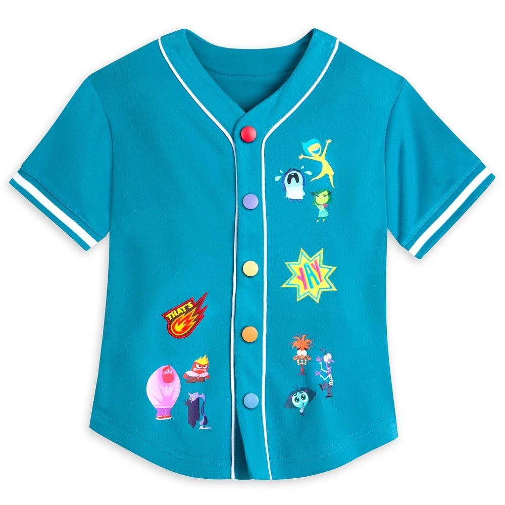 Emotions run high in this mesh athletic jersey featuring character screen art and embroidered emblems inspired by Disney and Pixar’s Inside Out 2. Multicolor snap front, contrast piping trim and striped ribbed cuffs express a joyful vibe.