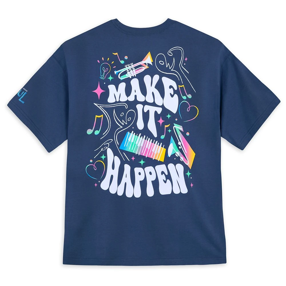 ”Make it happen” in this double-sided Soul tee with Twenty Two character graphic on front and text on the back, all in rainbow hues. Live every minute in it!