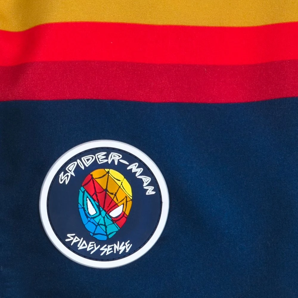 Heroic bands of bright color circle these Spider-Men swim trunks that will save the day when they’re heading to the beach or pool. The front features an appliquĂ© of the legendary Marvel character’s iconic mask with a rainbow design across it and the equally iconic ”Spidey sense” slogan.
