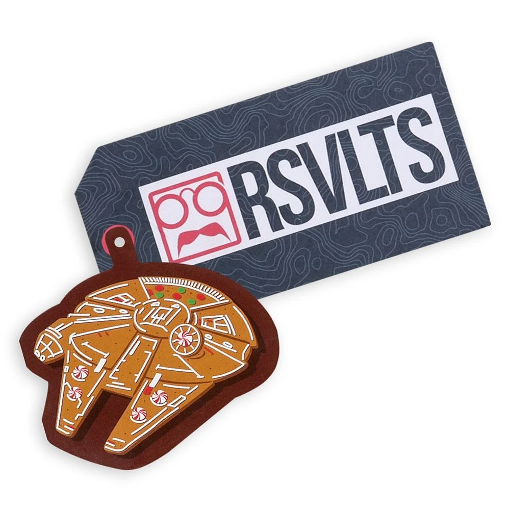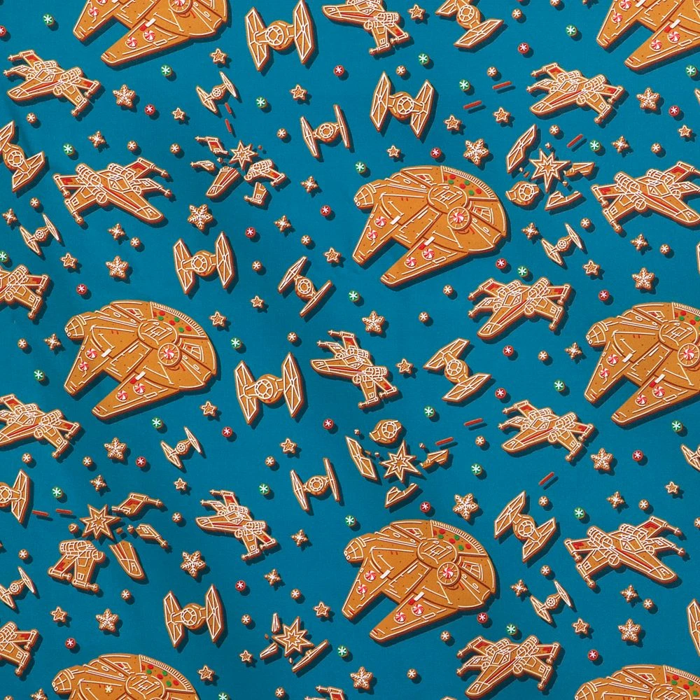 - Allover pattern features holiday cookie versions of the Millennium Falcon, X-Wing, TIE Fighters, stars, sprinklesΒ and blasts