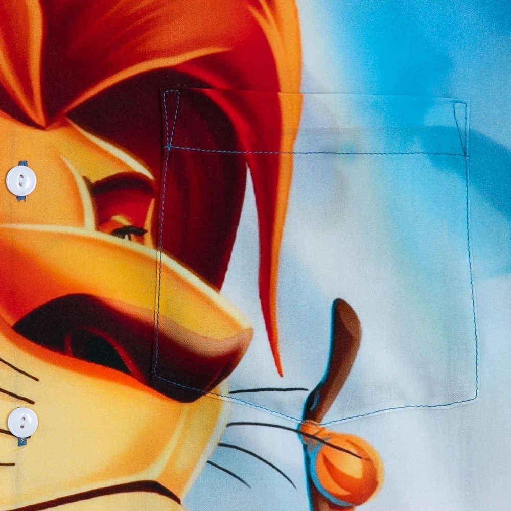 Mufasa looks regal as he looks out majestically from Pride Rock on the front of this Lion King camp shirt. A young Simba joins his father along with Rafiki, Timon and Pumbaa on the sublimated artwork covering this comfortable viscose button down shirt.