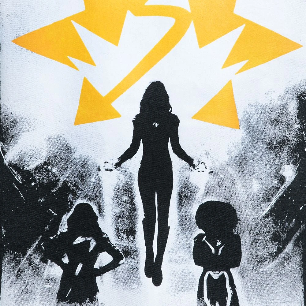 Three of the stars from The Marvels have teamed up on this dramatic black denim jacket inspired by the Marvel Studios movie. Captain Marvel, Ms. Marvel and Monica Rambeau are silhouetted on the dynamic screen art on the back, along with the film’s title. The front features a trio of symbols embroidered on the chest pocket below the title, making this perfect for when you’re power dressing.